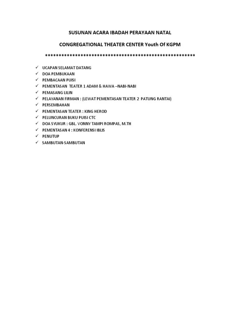 Contoh konsep/susunan acara untuk acara perayaan natal : Persiapan perayaan natal dibutuhkan beberapa minggu sebelum acara tersebut di laksanakan, salah satunya adalah penyusunan lagu lagu mulai awal ibadah sampai . Dari pulau dan benua & dia lahir untuk kami ( medley). Dalam sebuat acara ibadah maupun perayaan natal, dibutuhkan susunan acara agar acara yang berjalan sesuai dengan apa yang telah ditetapkan. Scribd adalah situs bacaan dan penerbitan sosial terbesar di dunia.